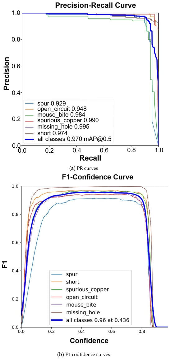Moreover, we adopt the PR curve and F1-condifence curve to prove the robustness of our MFAD-RTDETR model for PCB defect detection. The PR curve and F1-condifence curve of the MFAD-RTDETR model are shown in Figure 13. Based on Figure 13, the PR curve for the test set is very close to the upper right corner, which indicates that the classifier’s performance is exceptional. Additionally, the F1-confidence curve reveals that the proposed model achieves a good balance between precision and recall, demonstrating strong stability and reliability.