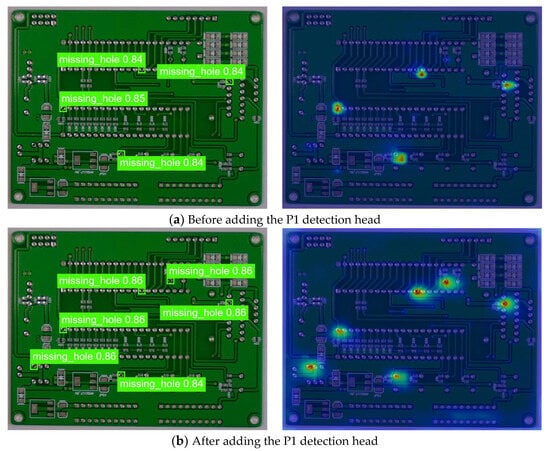 In addition, the visualization of heat maps corresponding to before and after the addition of the P1 detection head is shown in Figure 14. Obviously, the addition of the P1 detection head significantly enhances the detection performance and the detection effect on the test set is ideal. As shown in Figure 14a, the network without the P1 detection head performed poorly in detecting defects, failing to identify all defect points. Even when defects were detected, the heat map showed noticeable inaccuracies in localization, unable to precisely mark the exact locations of the defects. In contrast, after introducing the P1 detection head, a marked improvement was observed. In Figure 14b, the network with the P1 detection head successfully detected all missing holes on the PCB, with the heat map accurately pinpointing the location of each defect, demonstrating high localization precision. This improvement indicates that the P1 detection head plays a crucial role in enhancing the network’s overall detection performance and further confirms its effectiveness and reliability in practical applications. In summary, these results clearly demonstrate the positive impact of adding the P1 detection head, particularly in handling complex and fine-grained detection tasks, where its advantages become even more pronounced.