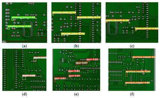 The configuration of our experiments includes an NVIDIA GeForce RTX 2060 SUPER GPU, and an Intel (R) Core (TM) i5-12400F CPU. The development language is Python 3.10.9, and the deep learning platform is the torch-2.0.1+cu117 based on the ubuntu22.04 system. The dataset used in the experiments was released by the Intelligent Robot Open Laboratory of Peking University. There are 693 pieces of original data in the dataset, which were divided into six categories: rat bite, leaky hole, short circuit, open circuit, burr, and pseudo-copper. Some classic defects are shown in Figure 10. The quantity of images in the PCB dataset and the number of each defect type are listed in Table 1. We augment the dataset to 1386 images using the rotation, scale, and translation operators. The dataset was then randomly divided into 970 samples for the training set, 138 samples for the validation set, and 278 samples for the test set, at a ratio of 7:1:2. The batch size was set to two, with a training duration of 300 epochs. The initial learning rate was set at 1 × 10−4, and the final learning rate was set at 1.