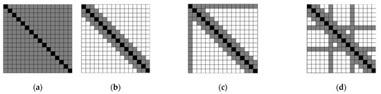Four attention mechanisms. (a) Global attention [38]. (b) Local attention [38]. (c) Hybrid 1: FTGA + local attention. (d) Hybrid 2: SGA + local attention.
