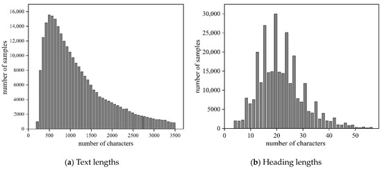 Figure 5 illustrates the distribution of text length and heading length in the dataset. Most texts have about 500 characters, and most headings have about 20 characters. The distribution of headline lengths generally conforms to a normal distribution, but there are considerably more articles with a heading length of 12, 14 and 19 characters.