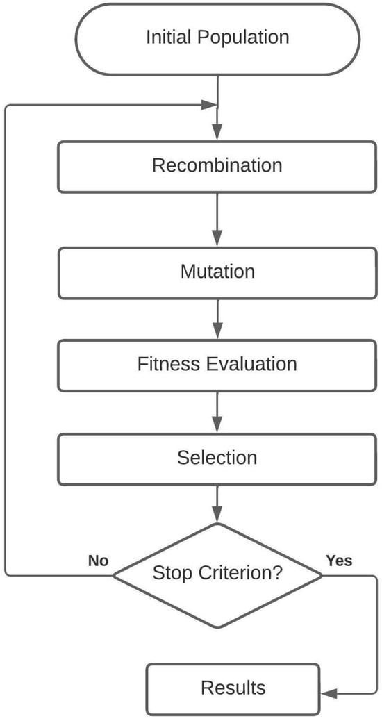 In this context, represents a population with individuals. denotes a set of individuals generated through recombination and mutation from . is a function of and can be zero or equal to . During the evaluation phase, each individual is scored based on its distance from the optimal solution. The best-performing individuals are then selected to form the initial population for the next generation. This iterative process continues until the stopping criterion is satisfied. The basic flowchart of the ES algorithm is shown in Figure 1.