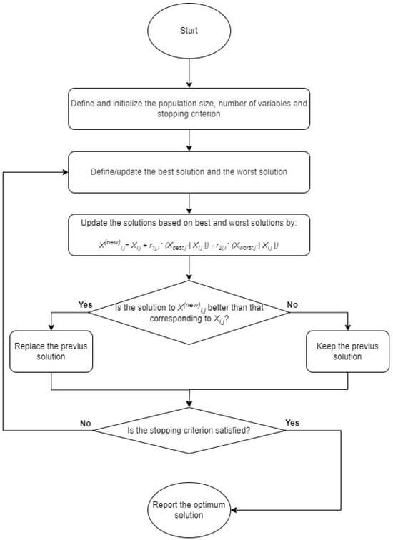 As shown in Figure 2, the Jaya algorithm begins with initialization and initial settings, where a population of solutions is randomly generated within the search space. Following this is the evaluation step, where each solution is assessed based on the problem’s objective function, and the best and worst solutions in the population are identified, crucial for the subsequent steps. The update step uses Equation (1) to adjust each solution, propelling them towards the best solution and distancing them from the worst. This process is repeated in a loop, where after each update, the solutions are reevaluated, and the best and worst are identified again. The loop continues until a stopping criterion is satisfied, such as reaching the maximum number of iterations or a specified convergence condition []. The flowchart ends when the algorithm presents the best solution found as the result.