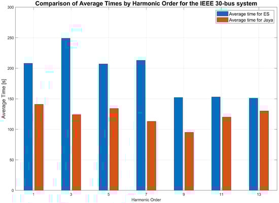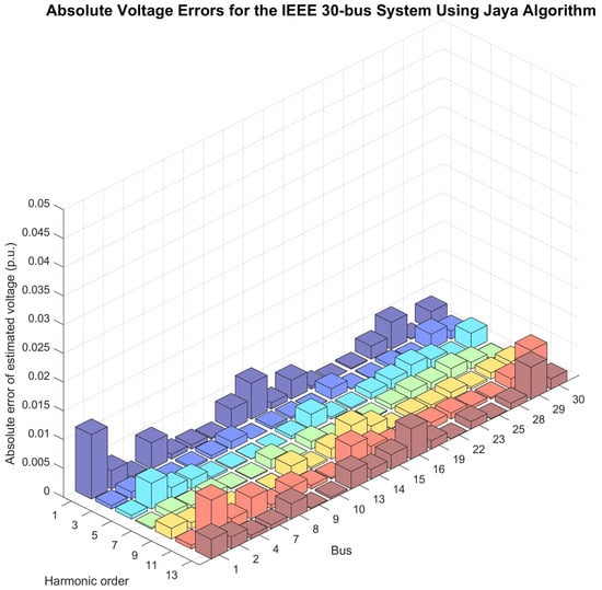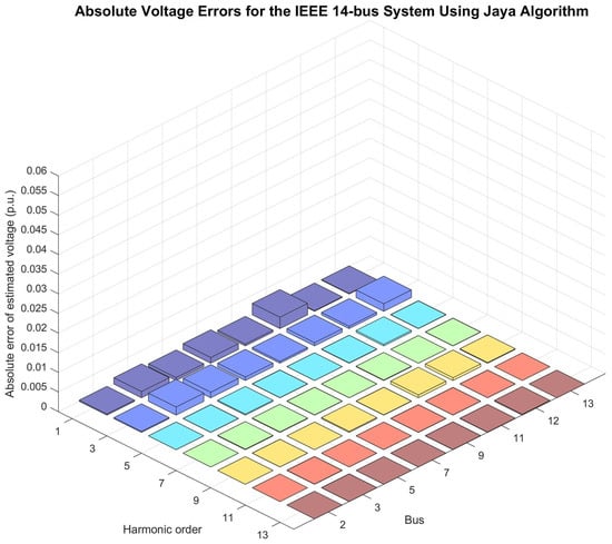 In the HSE process, following the selection of harmonic orders considered relevant for this study and the definition of individual representation, each is subjected to the state estimation algorithm proposed in this work, which is based on the Jaya algorithm or ES algorithm. The input data for the algorithm not only include the selected harmonic orders but also actual measurements of voltages and currents, coupled with the system’s admittance matrix. The execution of the algorithm for each harmonic of interest is meticulously carried out, and the results are compiled into a final report.