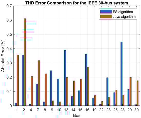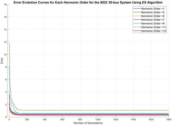 where is the estimation error at bus i, harmonic order h, is the calculated current at bus i from an individual who represents the voltages at the buses for selected harmonic orders, and is the measured current, harmonic order h at bus i. This error vector quantitatively represents the discrepancy between the estimated condition and the actual system condition, providing a crucial metric for performance evaluation. After calculating the errors for all monitored buses, the fitness of each individual analyzed for the specified harmonic order is calculated as the inverse of the sum of the squares of the error vector elements, as defined by