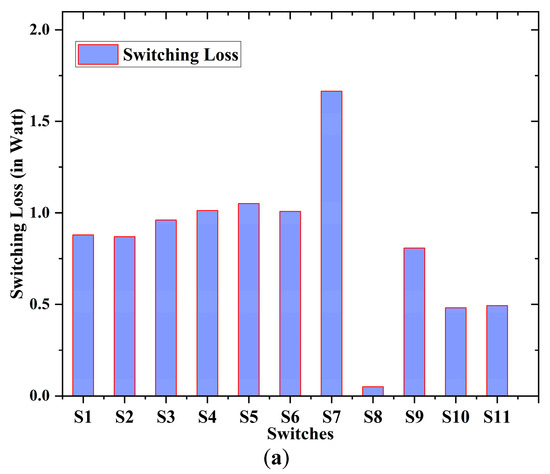 The highest switching loss occurs in switch S7, as it is heavily involved in generating the 25-level output, turning on and OFF ten times per cycle. In contrast, switch S8 experiences the lowest switching loss due to its minimal involvement in producing the 25-level output, switching ON and OFF only four times per cycle. Figure 15a–c show the bar graphs for the switching loss, conduction loss, and total loss of the eleven individual switches, respectively.