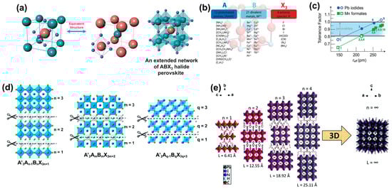 (a) General crystal structure of ABX3 HP (pink spheres: A cations, green spheres: B cations, and purple spheres: X (halide) anions). (b) A, B, and X sites are listed. (c) Tolerance factors. Reproduced with permission [7]. Copyright 2018, Wiley-VCH. (d) Schematic of 2D/quasi-2D HPs. (e) Crystal structure of 2D, quasi-2D, and 3D HPs. Reproduced with permission [20]. Copyright 2019, Wiley-VCH.