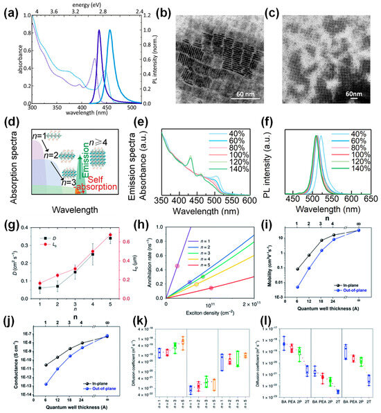 (a) Absorption and PL spectra (dashed lines and solid lines, respectively) of two- (purple) and three- (blue) monolayer nanoplatelets. (b) TEM images of two-monolayer nanoplatelets (thickness of 1.3 ± 0.2 nm). (c) TEM images of three-monolayer nanoplatelets (thickness of 19 ± 1 nm). Reproduced with permission [31]. Copyright 2020, American Chemical Society. (d) Energy transfer contributes to a more significant Stokes shift. (e) The absorption spectra of CsPbBr3 with varying PEABr content. (f) The photoluminescence spectra of CsPbBr3. Reproduced with permission [32]. Copyright 2023, Wiley-VCH. (g) Carrier diffusion constant in 2D perovskites. (h) Annihilation rate in 2D perovskites. Reproduced with permission [33]. Copyright 2020, Springer Nature. (i) Carrier mobility in 2D perovskites. (j) Conductance in 2D perovskites. Reproduced with permission [34]. Copyright 2018, American Chemical Society (k) Comparison of the impact of the n value on the diffusion coefficients. (l) Comparison of the impact of the ligands on the diffusion coefficients. Reproduced with permission [35]. Copyright 2021, Springer Nature.