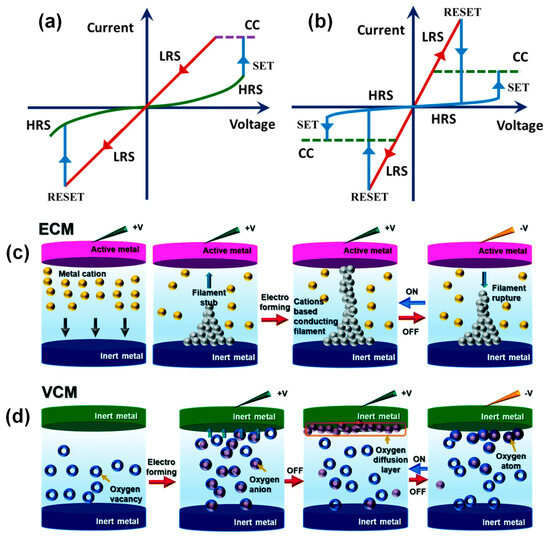 In recent years, extensive research has been conducted on the operational mechanisms of RS memory devices to predict and control their switching behaviors. This research aims to achieve optimal ON/OFF ratios, durability, retention, and sweep curves. This section presents two distinct operational processes of RS memory devices: the electrochemical mechanism (ECM) and the valence change mechanism (VCM).