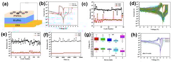 (a) The RS memory device structures of Ag/PMMA/HAPbI4/ITO. (b) I–V curves of 50 switching cycles of Ag/HAPbI4/ITO device. (c) Endurance data of Ag/HAPbI4/ITO device. (d) I–V characteristics of 130 cycles of HAPbI4-based device. (e) Endurance data of Ag/PMMA/HAPbI4/ITO device. (f) Retention data of Ag/PMMA/HAPbI4/ITO device. (g) Variation of VSET and VRESET for the five Ag/PMMA/HAPbI4/ITO devices. (h) I–V curves of the three Ag/PMMA/HAPbI4/ITO memory devices after 6 weeks. Reproduced with permission [75]. Copyright 2022, American Chemical Society.