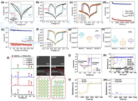 (a) I–V curves of MAPbI3−xClx-based devices. (b) I–V curves of 2D/3D heterostructure memory devices. (c) I–V curves of 2D/3D memory devices at first and after 300 sweeping time measurements. (d) Retention data of 2D/3D heterostructure memory devices. (e) Endurance data of 2D/3D heterostructure memory devices. (f) I–V curves of three different devices. (g) The current distribution of the LRS for three different devices. (h) The current distribution of the HRS for three different devices. Reproduced with permission, [76]. Copyright 2020, American Chemical Society. (i) XRD patterns of the 2D/3D HP film (left). The plane view of SEM images and cross-sectional SEM images (right). (j) I–V characteristics of 2D and 2D/3D HP-based memory devices. (k) The endurance data of 2D and 2D/3D HP-based memory devices. (l) Retention time of 3D HP-based memory devices. (m) Retention time of 2D/3D HP-based memory devices. Reproduced with permission [77]. Copyright 2020, American Chemical Society.