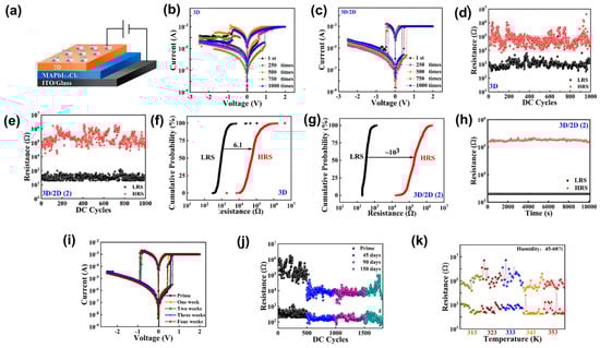 (a) Schematic illustration and 3D/2D perovskite device. (b) I–V curves in 1000 cycles of 3D devices. (c) I–V curves in 1000 cycles of 3D/2D perovskite devices. (d) Endurance cycles of 3D perovskite devices. (e) Endurance cycles of 3D/2D perovskite devices. (f) Statistical distribution of HRS and LRS of 3D perovskite devices. (g) Statistical distribution of HRS and LRS. (h) Retention time of 3D/2D perovskite devices over 104 s. (i) I–V curves of 3D/2D perovskite devices. (j) Endurance data over 500 cycles for 150 days. (k) Endurance data of the 3D/2D perovskite device. Reproduced with permission [84]. Copyright 2023, American Chemical Society.