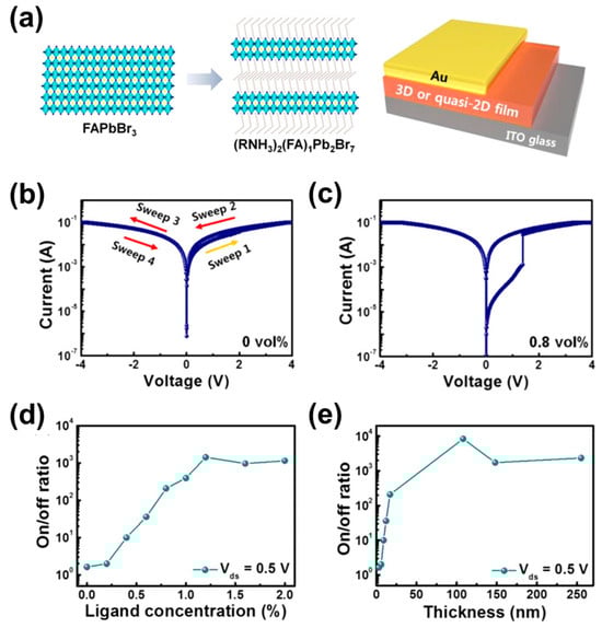 (a) Schematic of FAPbBr3 and (RNH3)2(FA)1PbBr7 structures and schematics of the device. (b) I–V curve of FAPbBr3-based memory device (0 vol%). (c) I–V curve of (RNH3)2(FA)1Pb2Br7-based memory device with ligand concentrations of 0.8 vol%. (d) ON/OFF ratio according to the concentration. (e) ON/OFF ratio with various film thickness. Reproduced with permission [86]. Copyright 2021, American Chemical Society.