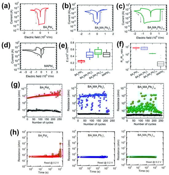 (a) I–V curves of BA2PbI4. (b) I–V curves of BA2MAPb2I7. (c) I–V curves of BA2MA2Pb3I10. (d) I–V curves of MAPbI3. (e) The operating voltage for the SET process. (f) The ON/OFF ratio for each material. (g) Endurance characteristics of BA2PbI4, BA2MA1Pb2I7, and BA2MA2Pb3I10-based memory devices. (h) Retention for LRS of BA2PbI4, BA2MA1Pb2I7, and BA2MA2Pb3I10-based memory devices. Reproduced with permission [87]. Copyright 2017, The Royal Society of Chemistry.