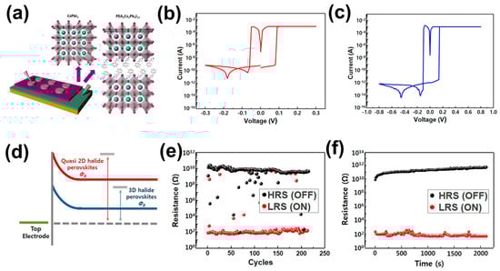 - Lee, S.M.; Kim, H.; Kim, D.H.; Kim, W.B.; Lee, J.M.; Choi, J.; Shin, H.; Han, G.S.; Jang, H.W.; Jung, H.S. Tailored 2D/3D Halide Perovskite Heterointerface for Substantially Enhanced Endurance in Conducting Bridge Resistive Switching Memory. ACS Appl. Mater. Interfaces 2020, 12, 17039–17045. [Google Scholar] [CrossRef]