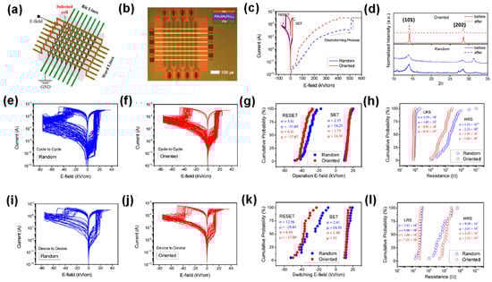Kim et al. investigated PEA2MA4Pb5I16, which would be appropriate for a comparative analysis of vertical alignment degree [95]. Random and orientated PEA2MAn−1PbnI3n+1 films formed without and with MACl additions, respectively. The 8 × 8 crossbar array devices are depicted in Figure 10a,b. Figure 10c depicts the electroforming process (dashed) and the SET and RESET process (solid). Applying electric bias fields, the orientated device displayed a low E-field in comparison to the random memory device. Enhanced charge transport behavior is indicated by the more significant current in the orientated device. Iodine vacancies have a low activation, so applying electric fields generates primarily formed filaments consisting of iodine vacancies. The vertically oriented perovskite is proposed to efficiently promote iodine vacancy migration along the vertical orientation, accelerating the electroforming E-field. Also, bipolar RS properties at a low electric field with an ON/OFF ratio above 102 were observed in both the random and directed devices. XRD patterns in Figure 10d are compared before and after the entire patterning process. Fifty I-E curves were examined in random (Figure 10e) and orientated (Figure 10f) devices. The statistical distributions (in Figure 10g,h) clearly illustrate that changes in the SET and RESET process and their LRS and HRS were more consistent in orientated devices than in random devices. I-E curves for the random (Figure 10i) and orientated (Figure 10j) crossbar arrays were assessed for device-to-device variability. Figure 10k,l show the associated statistical distribution. While the SET E-field and LRS showed only a minor improvement, the variations were much lower in the orientated device.