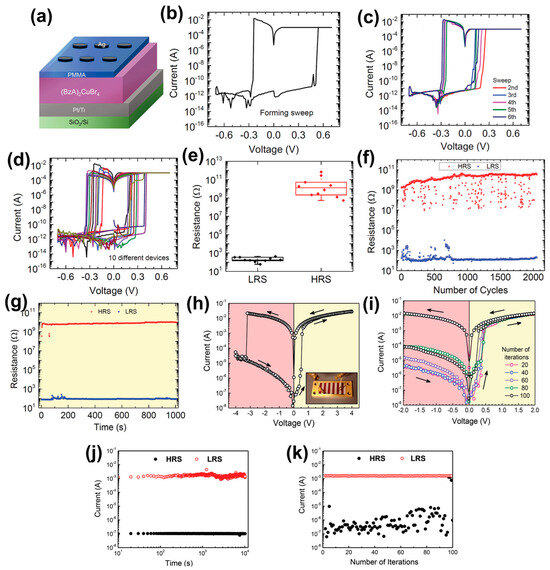 (a) Schematic of Ag/PMMA/(BzA)2CuBr4/Pt/Ti/SiO2/Si device structure. (b) First voltage sweep of (BzA)2CuBr4-based device. (c) Next five cycles of (BzA)2CuBr4-based device. (d) Ten different (BzA)2CuBr4-based devices. (e) Statistical resistance distribution of HRS and LRS. (f) Endurance of (BzA)2CuBr4-based device. (g) Retention time of (BzA)2CuBr4-based device. Reproduced with permission [96]. Copyright 2020, Wiley-VCH. (h) The typical I–V curves of ITO/Cs3Sb2I9/Al devices. (i) The I–V curves measured. (j) Retention times of LRS and HRS. (k) Endurance of ITO/Cs3Sb2I9/Al devices. Reproduced with permission [97]. Copyright 2021, Wiley-VCH.