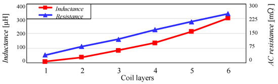 After selecting the wireless pad design, the number of turns and the placement of the magnetic material are determined. The number of turns is selected considering the allowable area of the pad, the inner diameter affecting the k, and current stress. The diameter of the pad winding is set to 1.5 mm due to Lp and k. The current stress is designed to be less than 10 Arms, considering the AWG gauge. The number of winding layers can be as high as six, considering the maximum height of the pad. As the number of turns increases, M increases, which reduces the current required to link the same magnetic flux. However, because the coil winding resistance increases, an appropriate number of turns should be selected considering the losses. Table 4 shows the magnetic characteristics depending on the number of winding layers of the transmitting pad. The number of turns per layer is fixed at 10, taking into account the inner diameter, and a ferrite magnetic material is added to the center of the pad to increase the coupling coefficient. The receiving pad is fixed at 13 turns in one layer due to the volume limitation of the receiving part. Table 4 shows that as the number of winding layers increases, the inductance and coupling coefficient increase. Figure 4 shows the inductance and winding resistance graph depending on the number of winding layers of the transmitting pad. Through Table 5 and Figure 4, it can be seen that a mutual inductance of up to 3.369 μH can be achieved (designed), and considering the losses due to winding resistance, it is designed for four layers.