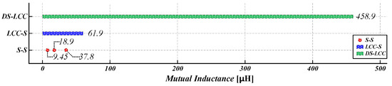 The design range of M capable of rated power transmission in the IPT system varies depending on the resonant network configuration. Figure 5 shows the achievable range of M for the S-S, LCC-S, and DS-LCC topologies. The inverter is assumed to operate at a fixed duty cycle of 0.5 and a fixed operating frequency of 100 kHz. For the S-S topology, the output characteristics are determined by uin, M, and f, which leads to a highly restricted designable M range. Conversely, the LCC-S and DS-LCC topologies have their output characteristics determined by primary or secondary LC resonant tanks. Moreover, the current flowing through the primary pad is determined by the primary LC resonant tank, while the output-side current is determined by the secondary LC tank. Consequently, as higher-order networks are configured, the range of designable M that can meet the rating is increased.