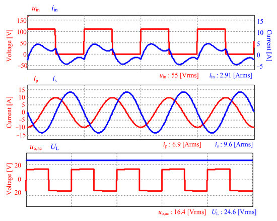 The FEM simulation results in Figure 8 show that Minp, the mutual inductance between Lin and Lp, and Mins, the mutual inductance between Lin and Ls, are nearly zero, indicating that the mutual inductance can be neglected. Based on the pad characteristics in Figure 8, the system specifications are configured as shown in Table 5. Figure 9 shows the PSIM simulation results when applying the pad from Figure 8 and the system specifications from Table 5. Figure 9 confirms that the proposed system configuration achieves zero voltage switching (ZVS) and rated output characteristics.