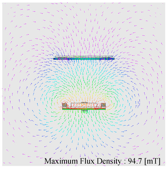 Figure 10 shows the FEM simulation results when applying the system specifications from Table 6. The maximum flux density is 94.7 mT, which suggests that the magnetic material of the primary pad with the integrated coil structure does not saturate.