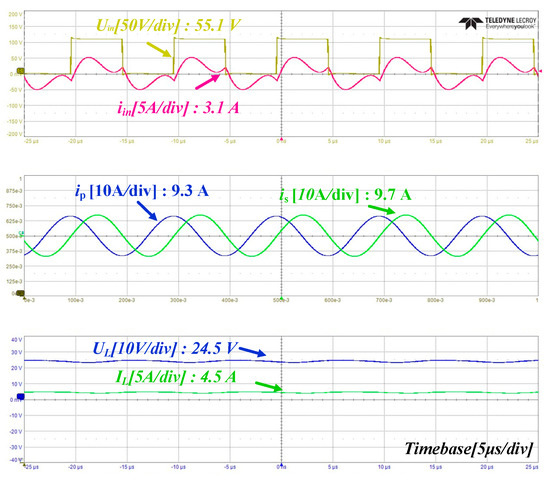 Figure 13 illustrates the experimental results of the IPT system. The output characteristics meet 100 W and 24 V, achieving an efficiency of 69.8%. Figure 14 shows the experimental waveforms, confirming the operation of ZVS.