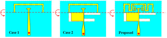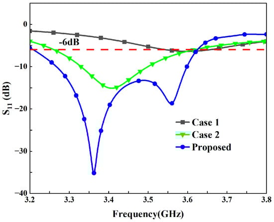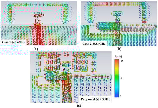 To sufficiently analyze the design process of the designed antenna element, Figure 1 presents three different design cases of the antenna element, all of which use a T-shaped 50-ohm microstrip line for feeding. In Case 1, the vertical side of the substrate is a C-shaped radiating element. The S-parameter results obtained through CST simulation, as shown in Figure 2, indicate that the resonance frequency of this antenna element is 3.6 GHz, but the reflection coefficient is high and the impedance matching is poor, leading to current being concentrated on the T-shaped feed line, while the current on the C-shaped radiating element is almost zero, as shown in Figure 3a. However, Case 2 is derived from Case 1 by introducing a U-shaped slot on the ground plane of the main substrate and adding a rectangular radiating element on the left side of the T-shaped microstrip line. Compared with the S11 parameter in Case 1, the antenna element in Case 2 shows improved impedance matching, with a resonance frequency of 3.4 GHz and a bandwidth of 300 MHz. As shown in Figure 3b, in Case 2, there is current present on the outer sides of the U-shaped slot and the left rectangular radiating element, and the T-shaped feed line radiates electromagnetic energy toward the C-shaped radiating element. As a result, the current on the C-shaped radiating element is no longer zero, but the current on its two side arms remains low. To address these problems, the C-shaped radiating element was modified into a meandering looped radiating element using bending techniques based on Case 2. By analyzing the S-parameters in Figure 2, it can be concluded that the resonance frequency shifts to the left, generating a second resonance point, which increases the operating bandwidth to 400 MHz, achieving wideband performance and better impedance matching. Figure 3c shows that the current is mainly distributed along the sides of the meandering, looped radiating element and the U-shaped slot, significantly increasing the effectiveness of the radiating elements compared to those in Case 2.