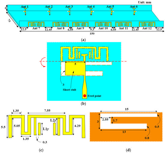 As shown in Figure 4, the layout and specific dimensional details of the designed 12-element antenna array are presented. In addition, the antenna element mainly consists of two parts: a meandering, looped structure and a U-shaped slot. Figure 5 depicts the fabricated photographs of the designed antenna array. For the intelligent communication terminals presently concerned, it can be applied on a 150 × 75 × 0.8 mm3 system-grounded substrate. As shown in Figure 4a, two of the same 6-antenna arrays are, printed on the bilateral-system-grounded substrate, thus forming a 12-element antenna array. Certainly, all substrate models in the designed smartphone antenna array system are FR-4(εr = 4.4, tan δ = 0.02), and their thickness is 0.8 mm. Due to the confined space within a smartphone, clearance areas on the system-grounded substrate are necessary to accommodate the presence of two antennas in order to support 2G/3G/4G communications. For example, a dual-wideband loop antenna is proposed for the LTE frequency band and can be used in reserved clearance regions []. However, in this work, the impact of the two antennas arranged in the two clearance regions on the designed antenna system is not considered.