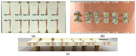 Photos of the fabricated 12-element antenna array: (a) Top view. (b) Back view. (c) Side view.