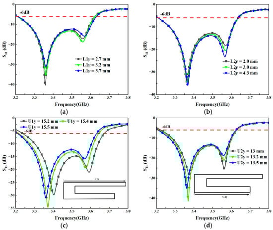 Parameter analysis of the resonant frequency point of the antenna element with different values: (a) L1y, (b) L2y, (c) U1y, and (d) U2y.