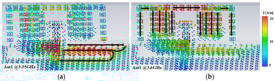 Current distribution of the antenna element (a) at 3.35 GHz and (b) at 3.6 GHz.