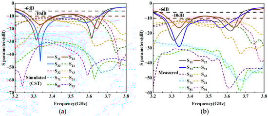 It Is worth noting that, by comparing Figure 2 and Figure 8a, it can be seen that the low-resonance point, 3.35 GHz, shifted to the left by about 50 MHz, while the high-resonance point 3.6 GHz has shifted to the right by about 10 MHz, and the operating bandwidth has been increased from the original 400 MHz to 500 MHz. This is thanks to the layout technology of the antenna array, which causes a slight shift in the two resonance points of the designed antenna, and increases the operating bandwidth by 100 MHz. However, due to the influence of uncertain factors such as fabrication errors and the experimental environment, there is a certain error between the S-parameter simulation results and the measurement results of the antenna. In other words, the experimental S-parameters in Figure 8b are essentially consistent with the simulated S-parameters in Figure 8a.