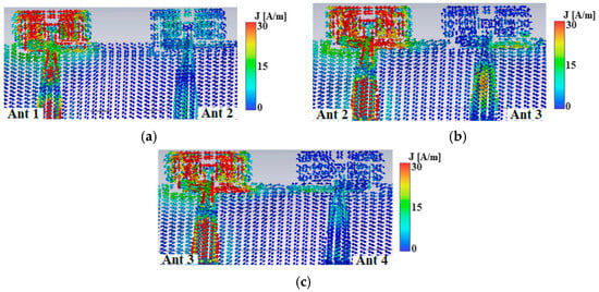 Current distribution. (a) Ant1 is excited. (b) Ant2 is excited. (c) Ant3 is excited.