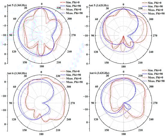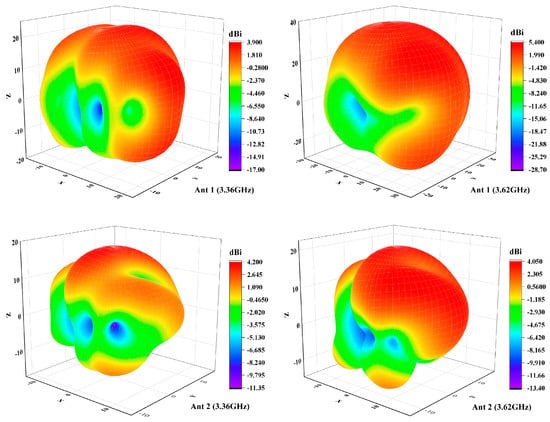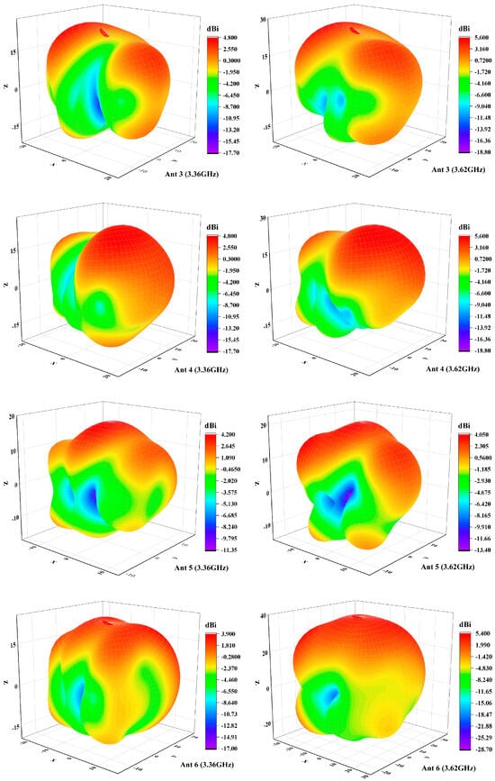 To thoroughly analyze the radiation characteristics of the designed wideband antenna array, we conducted rigorous and comprehensive tests in a microwave anechoic chamber to ensure its accuracy and reliability, as shown in Figure 10. During the experimental measurements and simulations, each port was individually fed, while other ports were matched to 50 Ω. As illustrated in Figure 11, the 2D far-field radiation patterns of Ant1 to Ant6 in the E-plane (phi = 0) and H-plane (phi = 90) at 3.36 GHz and 3.63 GHz frequencies demonstrate that the antenna exhibits nearly omnidirectional radiation characteristics in the XOZ plane at both frequencies, with exhibiting slightly stronger radiation in the Z direction. In contrast, the YOZ plane reveals the unique characteristics of the antenna, with slightly stronger radiation in the +Y direction. In addition, to further intuitively analyze the radiation performance of the designed antenna, Figure 12 provides a 3D far-field radiation pattern that offers a better explanation of Figure 11. From Figure 11 and Figure 12, it can be observed that the far-field radiation patterns of Ant1 to Ant3 and Ant4 to Ant6 are mirror-symmetrical in the XOZ plane, which is consistent with the structure of the antenna array. Due to the symmetric design of the designed MIMO antenna system, the far-field radiation patterns of the remaining antenna elements are omitted here for brevity. Overall, these results indicate that the wideband antenna array possesses omnidirectional radiation and good gain characteristics within its operating frequency range, meeting the radiation performance standards for smartphone antennas.