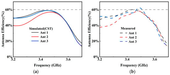 For Ant1 to Ant3, Figure 13 clearly presents the simulation and measurement results of the total efficiency, where Figure 13a states that within the required operating bandwidth, the simulated antenna efficiency of Ant1 is about 2% to 10% higher than that of Ant2 and Ant3. This is because Ant1, arranged on the outside of the antenna array, has lower coupling loss and better antenna efficiency. In contrast, the antennas of Ant2 and Ant3 are slightly less efficient because of high-er coupling losses from the adjacent antennas on either side of them. As depicted in Figure 13b, the antenna experimental efficiencies are approximately 16–62%, aligning well with the simulation results.