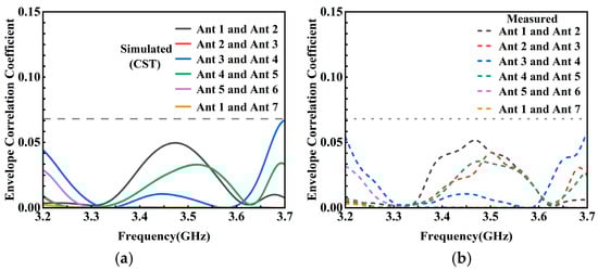 To further analyze the MIMO performances of the designed 12-element antenna array, the ECC needs to be considered another important parameter. The ECC is not only an important parameter for evaluating the correlation of radiation patterns between any two antennas in antenna array [], but also a key parameter with which to evaluate diversity gain in MIMO antenna systems. The ECC can be determined through the computation of experimentally experimental complex electric field patterns, and its value should be less than 0.5 in engineering applications []. Figure 14 illustrates the simulated and measured ECC values for any adjacent antennas within the designed wideband antenna array. As shown in Figure 14a, at 3.2–3.6 GHz, all ECC values are less than 0.05; however, at 3.6–3.7 GHz, except for the ECC values between Ant3 and Ant4, the other ECC values are all less than 0.03. In conclusion, the designed wideband antenna array exhibits excellent performance, with ECC values lower than 0.065 among the antenna elements, which means that there is a low correlation between the individual antenna elements and that the measurement and simulation results show excellent agreement, as demonstrated in Figure 14b.