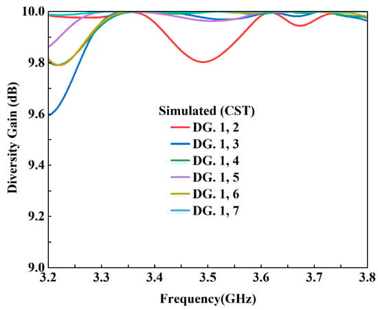 Figure 15 depicts the simulated diversity gain (DG) values of the designed antenna, which can be calculated using the Envelope Correlation Coefficient (ECC) []. It clearly illustrates that the DG of the antenna array exceeds 9.8 dB within the operating bandwidth, except for the minimum DG value of 9.6 dB between Ant1 and Ant3. In theory, the DG value of the MIMO antenna system for smartphones should be around 10 dB within its operating bandwidth. However, these results are within the acceptable range.