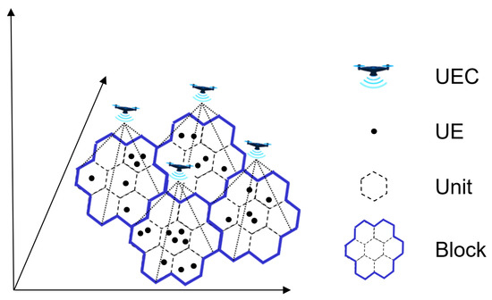 - UAVs with edge computing servers (UECs): UECs are responsible for communicating with UEs in their designated blocks, and for processing offloaded AR tasks upon receiving requests from those UEs.