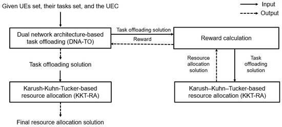 This section presents the dual network architecture-based task offloading algorithm and the Karush–Kuhn–Tucker-based resource allocation algorithm. The proposed framework is shown in Figure 3. Specifically, DNA-TO minimizes the objective, and the best task-offloading decision is obtained. The reward of each DNA-TO solution is calculated based on the resource allocation solution from KKT-RA. The remainder of this section describes DNA-TO and KKT-RA in detail.