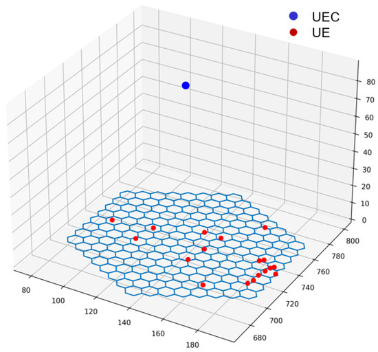 where and are the average additional losses of the free propagation space loss under LoS and NLoS conditions, respectively; a and b are constants that depend on the propagation environment (e.g., in urban [31], a = 9.61, b = 0.16); h is the height of the UEC and d is the distance between a UE and the UEC’s projection on the ground, while f is the carrier frequency, and c is the speed of light.