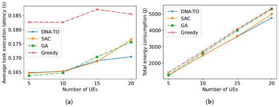 The results from varying the number of UEs. (a) Average task execution latency. (b) Total energy consumption.