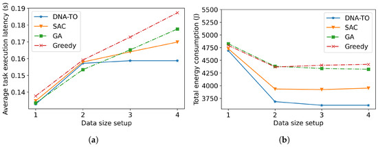 Figure 9b presents the total energy consumption of the four different algorithms (DNA-TO, SAC, GA, and greedy) across the various data size setups. Overall, total energy consumption decreased when data size increased. The lowest energy consumption was obtained by DNA-TO, while the GA archived the highest value. This indicates DNA-TO can effectively minimize energy consumption while maintaining performance.