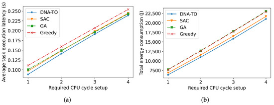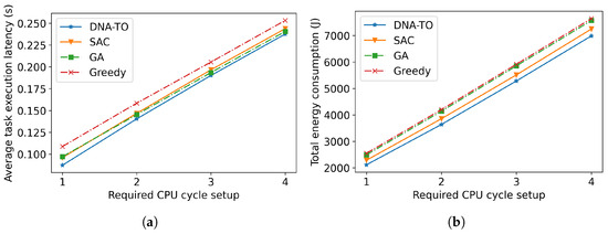 Figure 7a illustrates the relationship between average task execution latency and the required CPU cycles. As the required CPU cycles increased, there was a general upward trend in latency. The greedy algorithm showed the most significant increase in latency, followed by the GA, the SAC, and DNA-TO. DNA-TO obtained the lowest latency for all CPU cycle setups.