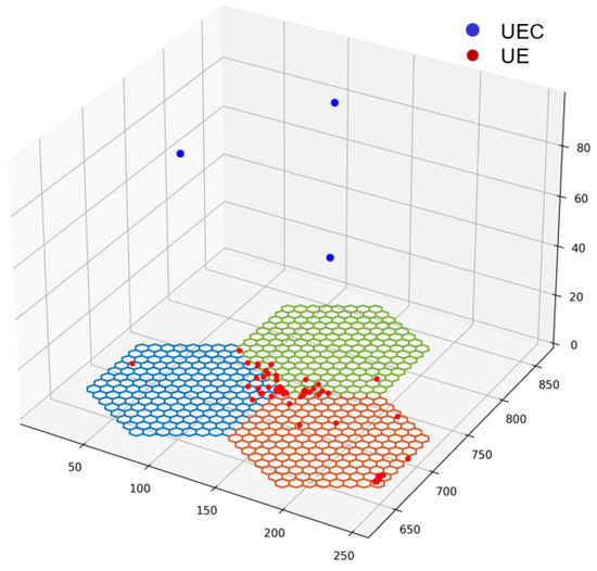 As shown in Figure 8, this section evaluates the proposed algorithm in a scenario with three UECs. Each UEC was responsible for 20 UEs in each block. The effects from varying the task sizes and the required CPU cycles are investigated and analyzed. For the different task sizes, the configurations detailed in Table 3 were employed, while varying the CPU cycle requirements used configurations specified in Table 4.