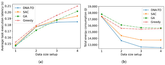 Figure 9a displays the average task execution latency for different data size setups. It shows a trend similar to the single UEC scenario. When the data size increased, latency increased, indicating that larger data sizes lead to longer processing times. DNA-TO outperformed the other algorithms, maintaining the lowest average latency with larger data sizes (e.g., setups 3 and 4). This demonstrates that DNA-TO schedules tasks effectively, even with large data sizes.