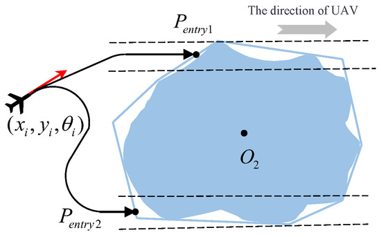 Area targets refer to whose length and width are both greater than the reconnaissance width of the UAV. Typical area targets include lakes, bases, plazas, and so on. To fully reconnaissance area targets, the UAV’s reconnaissance range needs to cover the target in a curved path, as shown in Figure 2, where represent the current position of UAV, which can be regarded as a directed particle. The UAV needs to determine whether to enter this area from or based on dynamic and cost constraints. In order to generate a reconnaissance path for area targets that takes into account the UAV’s maneuverability, a parallel pattern is adopted to generate the minimum length zigzag reconnaissance path.
