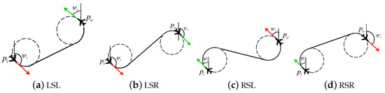 Dubins [7] curve demonstrates that a robot-like entity, with an initially specified heading, can reach the final position and heading via three path segments. Figure 3 illustrates four common configurations of Dubins paths composed of two curved segments and one straight segment, respectively are LSL, LSR, RSL, RSR, where R is the clockwise direction, L is the counterclockwise direction, and S is the straight line.