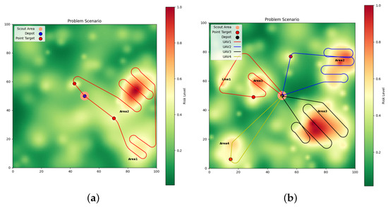 In this section, numerical simulation experiments were conducted to evaluate the effectiveness of the established model and proposed methods. The experiments were conducted on a personal computer equipped with an Intel(R) Core(TM) i7-13650HX 2.60 GHz CPU and 16 GB RAM, running in a Python 3.8 environment. The parameter design for the simulation experiments is as follows: The task area is confined to a square region of 100 × 100 units. The reconnaissance width for each drone is set to three units, with a minimum turning radius of three units. The probabilities of crossover and mutation are set to 0.6 and 0.05, respectively. The task targets are randomly generated, with each point on the map containing a normalized risk value ranging from 0 to 1.