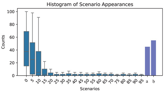 To demonstrate that ACD-NSGA-II outperforms other algorithms (e.g., PSO, ACO, NSGA-II, and GA) in common scenarios, independent experiments were conducted 100 times with random scenarios. The results were analyzed for each Pareto frontiers’ convergence shown in Figure 7. It represents a histogram of the number of times different scenes appear in the last generation.