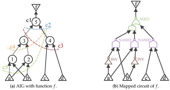 - k-feasible Cut. A feasible cut C of the node of the AIG is a set of nodes in its transitive fanin such that every path from PIs to v passes through at least one node in C. Each node is called the leaf of the cut c, and a cut is considered k-feasible if it has a maximum of k leaves. A trivial cut of node v consists solely of v itself. Thus, for a node n with two fanins u, v, the set of k-feasible cuts can be computed by combining the set of cuts of u and v [32]:That is, the k-feasible cuts of can be iteratively computed by traversing from PIs to POs. Besides, Figure 1a shows an AIG example and the set is the 3-feasible Cut of node 5.